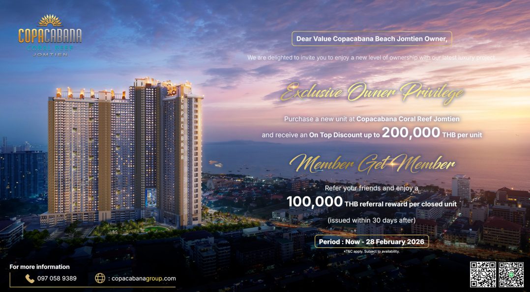 04 ก.พ. 26 admin news, pattaya, review 0 Comments อภิสิทธิ์เฉพาะลูกค้าเก่าจาก Copacabana Beach Jomtien เท่านั้น กลับมาเป็นเจ้าของยูนิตใหม่ที่ Copacabana Coral Reef Jomtien แนะนำเพื่อนมาซื้อ รับค่าแนะนำ 100,000 บาท/ยูนิต Read more